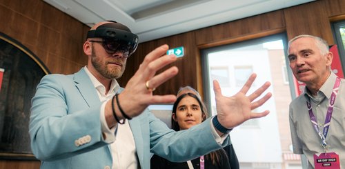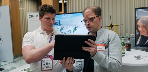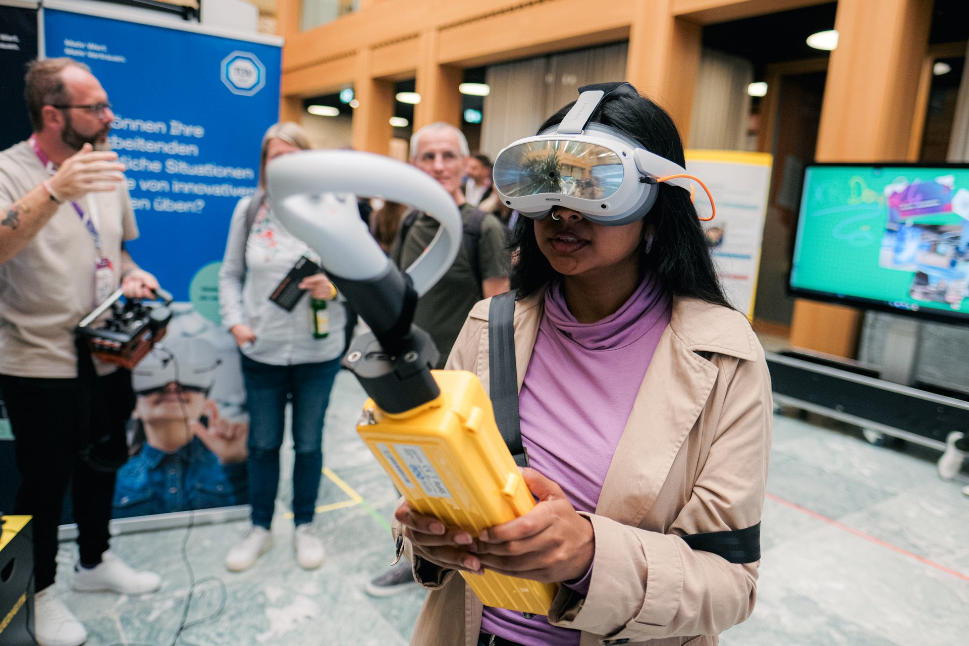 Im Anschluss wurde die Ausstellung im Atrium der IHK offiziell eröffnet und die Gäste konnten die neuesten Projekte, Prototypen und Exponate des XR HUB Netzwerks erkunden. Besondere Highlights waren unter anderem ein VR-Kranführerschein, Apple Vision Pro, ein VR-Schneepflugsimulator und viele weitere innovative Anwendungen. Diese interaktiven Stationen boten den Teilnehmern die Möglichkeit, die Technologien selbst auszuprobieren und wertvolle Kontakte innerhalb der Branche zu knüpfen.